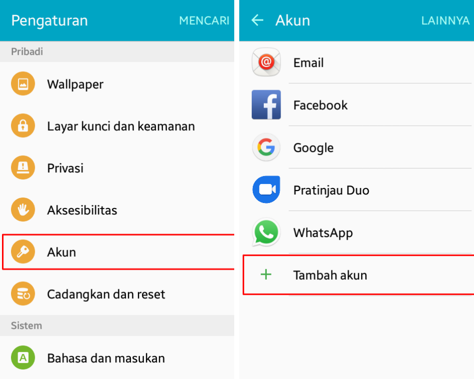 Di menu pribadi, pilih submenu Akun seperti pada gambar di atas. Nah, setelah kalian klik akan muncul tampilan baru lagi dan langsung saja klik + Tambah akun. Biasanya menu tambahkan akun letaknya oaling bawah. Kareba kalian sudah klik maka akan muncul lagi tampilan seperti yang ada di bawah ini.