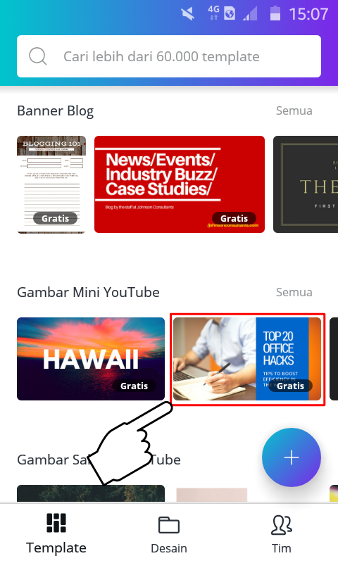 Di halaman awal (halaman awal pada aplikasi ini adalah menu Template itu sendiri), cari lalu gulir ke bawah dan temukan Gambar Mini YouTube. Sesuai dengan gambar di bawah pilih yang tandai dengan garis luar warna merah atau yang telah ditunjuk.