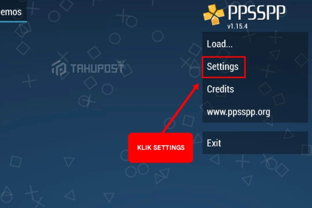 Silakan buka aplikasi PPSSPP Gold lalu di beranda aplikasi, klik tombolSettings yang ada di sebelah kanan.